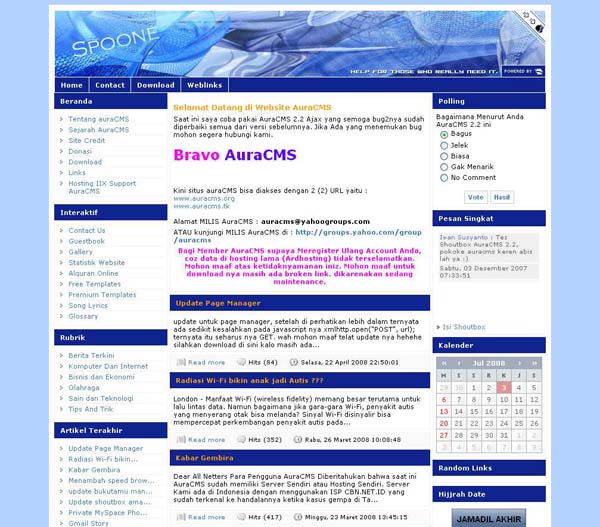 Bagi anda yang menggunakan website CMS (Content Management System) AuraCMS, mungkin template bawaan yang diikutkan dalam script tersebut hanyalah auracms. Nah sekarang anda bisa mendownload secara gratis free template Spoone Blue AuraCMS tersebut disini. Untuk kali ini saya akan memberikan template gratis untuk anda yaitu Spoone Blue Premium Themes.