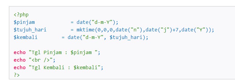 Aplikasi seperti perpustakaan atau periklanan sering kali kita jumpai bahwa jumlah iklan dihitung lama tayang (hari), nah bagaimana cara mengetahui misalkan kita pasang iklan saat ini untuk 30 hari kedepan. Caranya adalah dengan menggunakan mktime sebagai berikut :